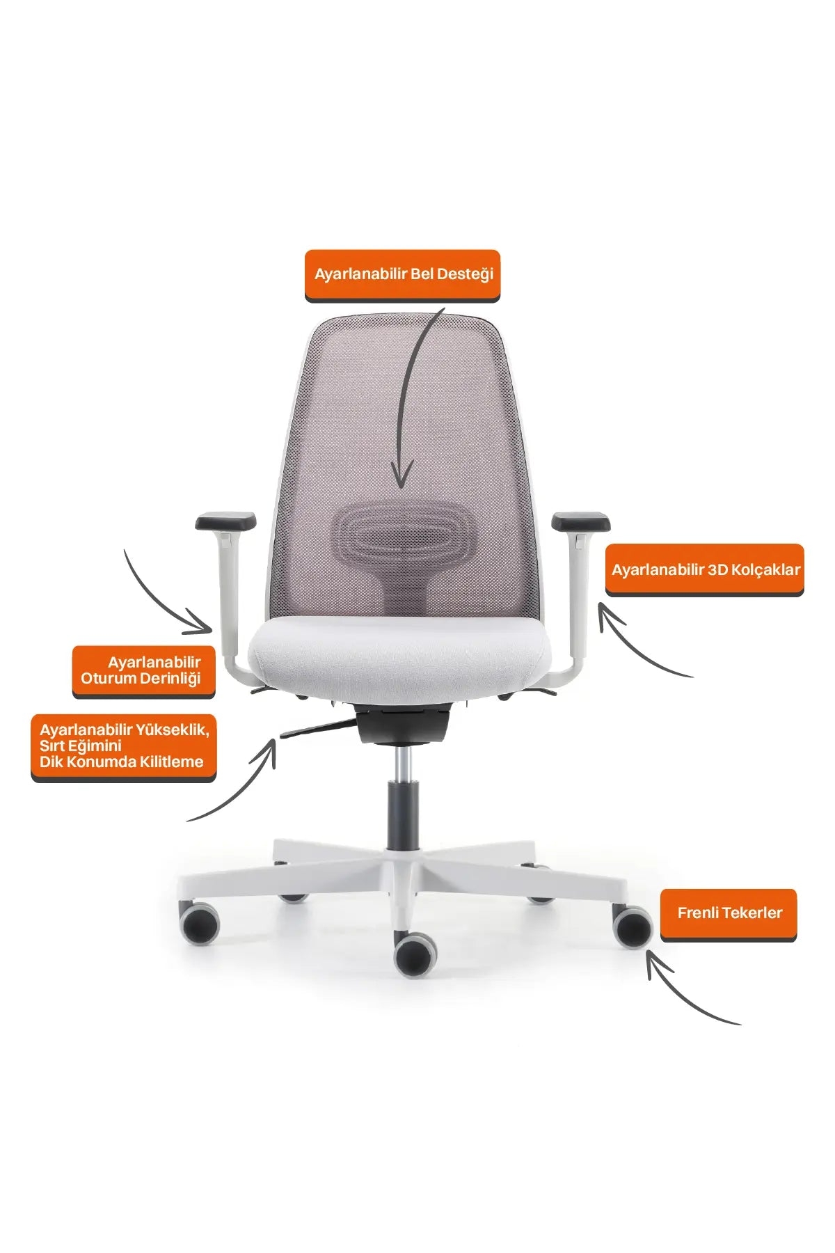 Çalışma süreniz boyunca bedeninizi destekleyerek doğru pozisyonda oturmanızı sağlayan Air Soho’nun bel desteği, oturum derinliği, yüksekliği, kolçakları ve kol destekleri ayarlanabiliyor. Sırt eğimi sırasında, sırt ile oturma fontu senkron hareket ederek beliniz ve sırtınız arasındaki mesafeyi dengeli bir şekilde koruyor.