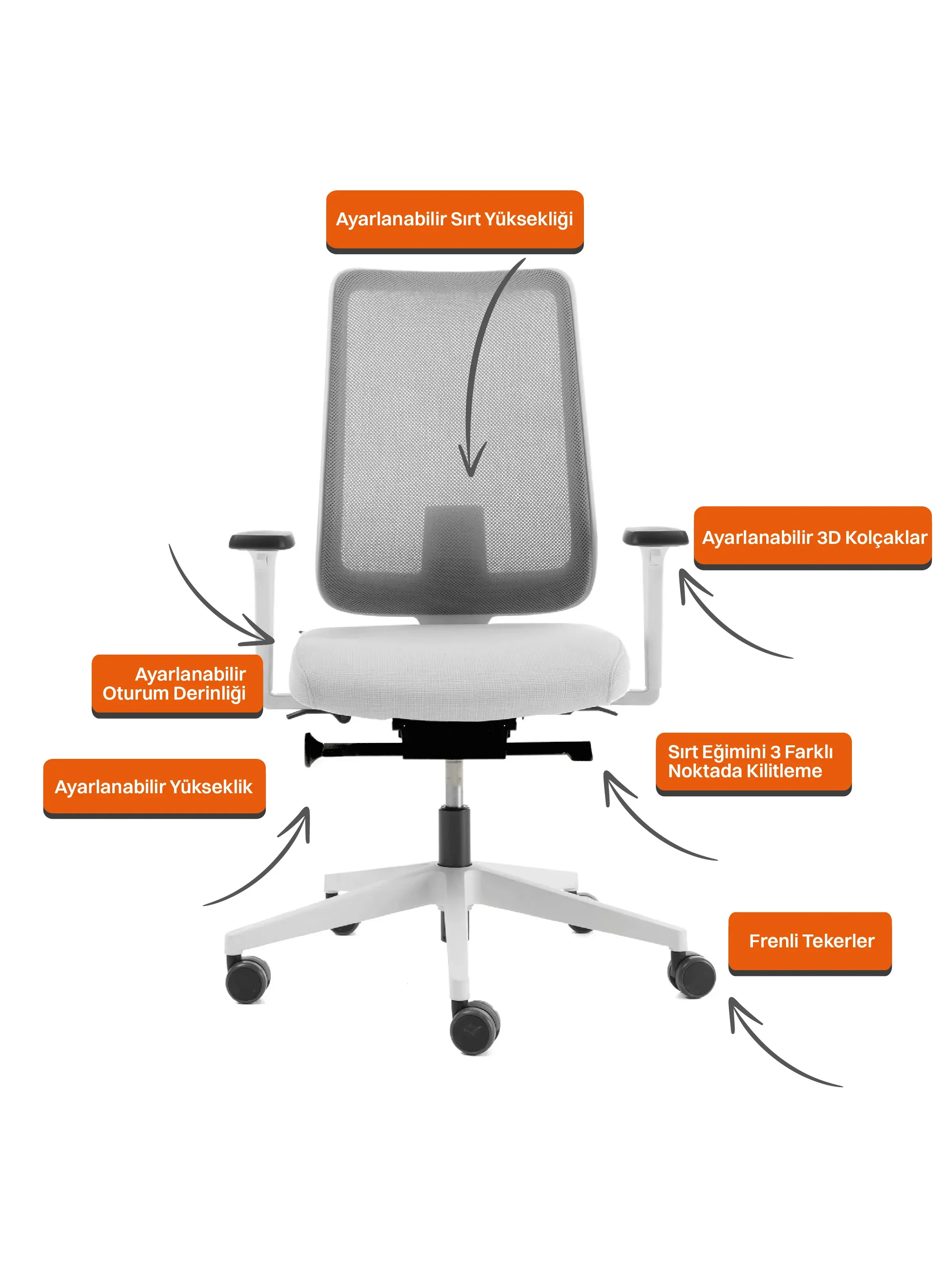 • Oturma Derinliği Çalışma koltuklarında oturma derinliğinin ayarlanabilir olması farklı bacak boyuna sahip kullanıcılar için doğru oturma pozisyonu sağlar.