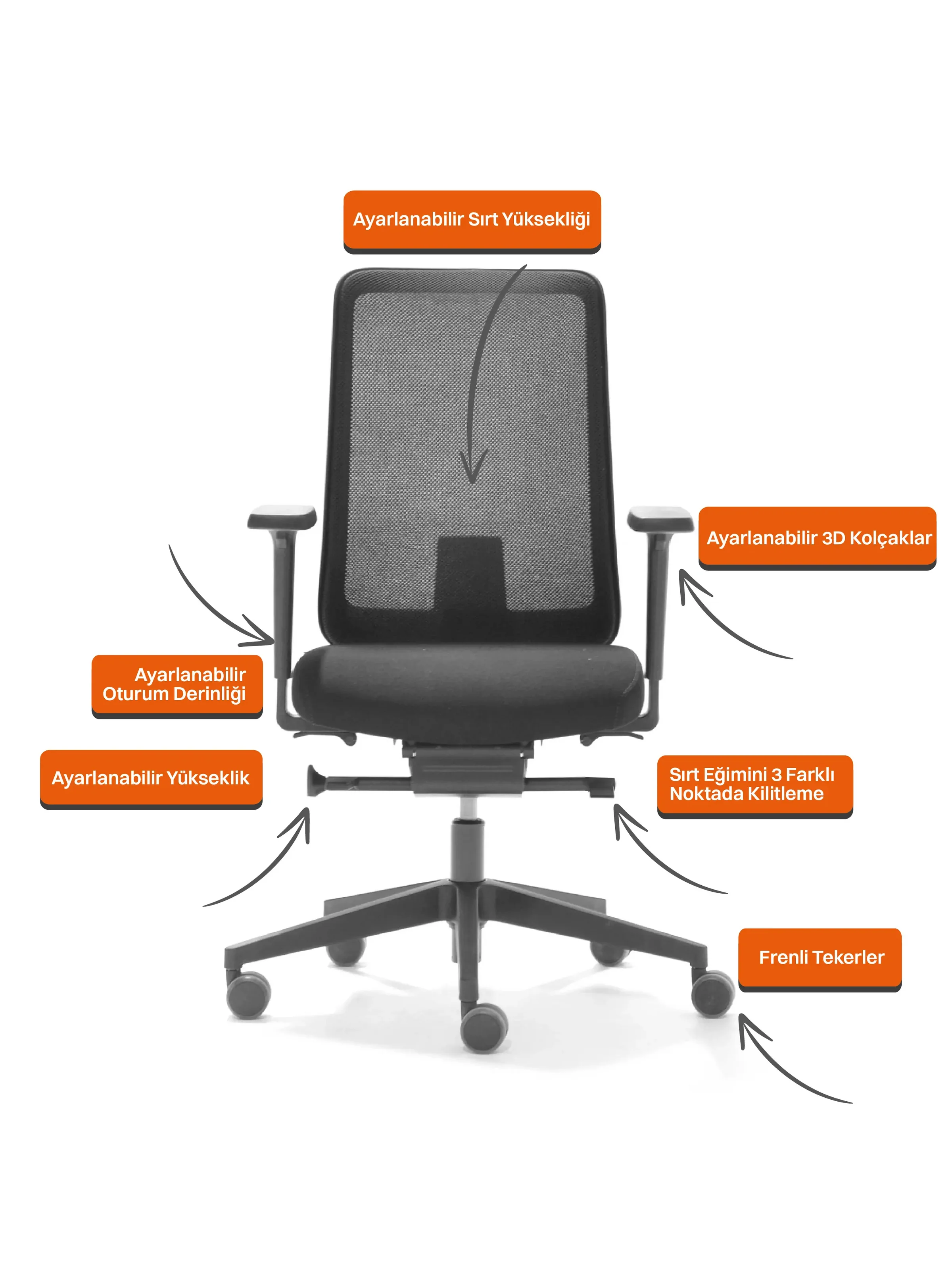 • Oturma Derinliği Çalışma koltuklarında oturma derinliğinin ayarlanabilir olması farklı bacak boyuna sahip kullanıcılar için doğru oturma pozisyonu sağlar.